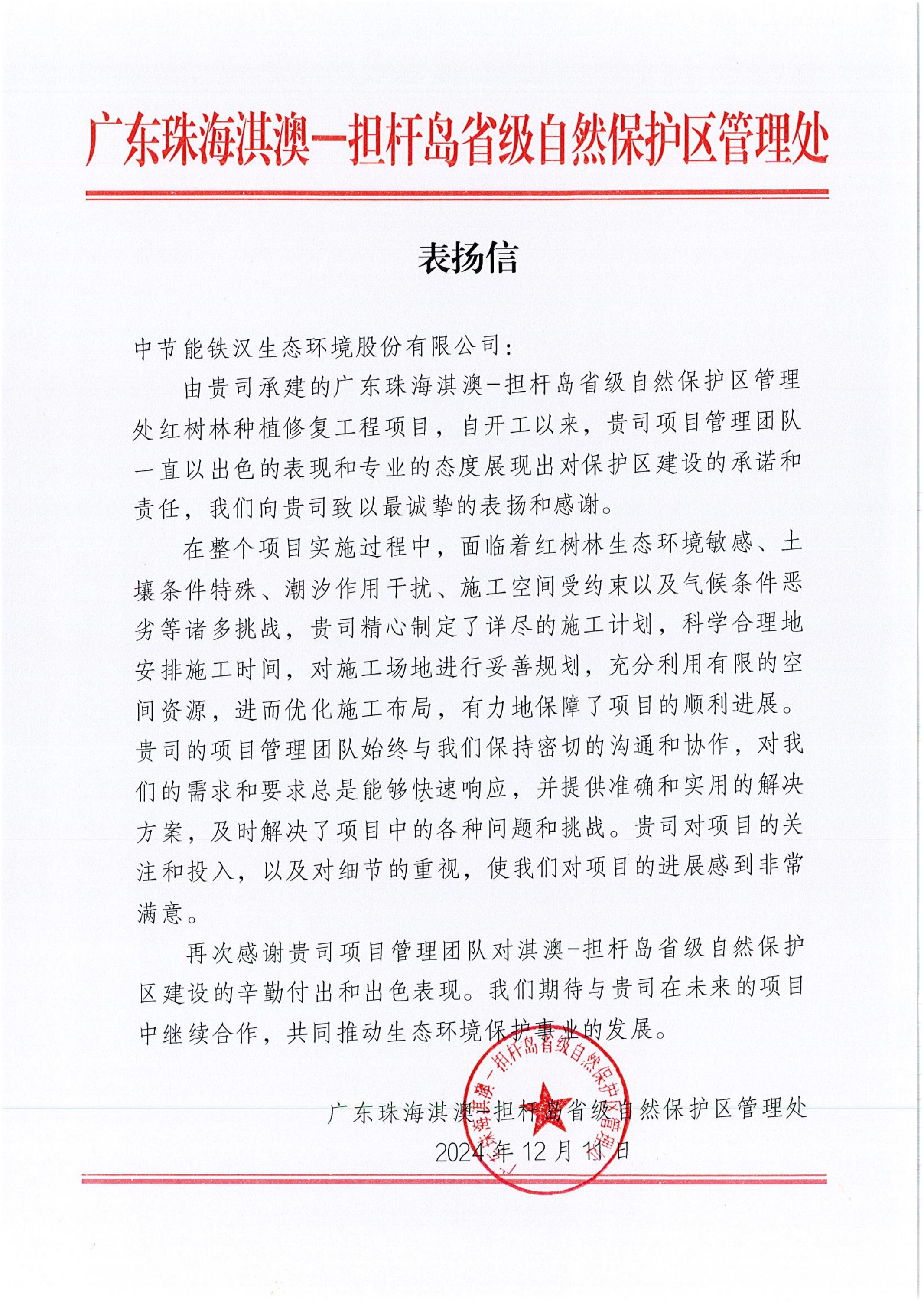 12月11日,由中節能鐵漢承建的廣東珠海淇澳-擔桿島省級自然保護區管理處紅樹林種植修復工程獲得業主單位來信表揚。